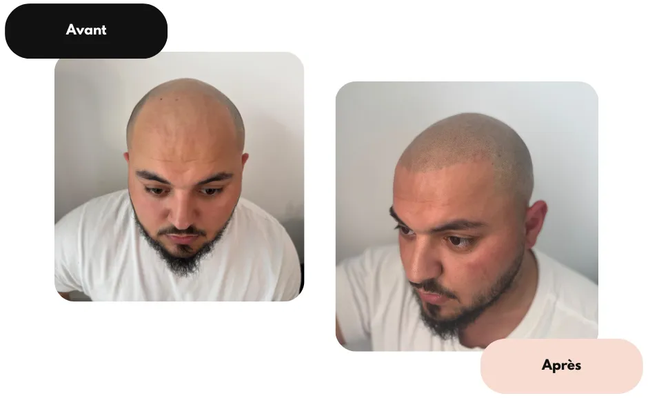 "Mathieu, 29 ans — Marqué par une calvitie depuis ses 20 ans. En seulement 3 séances, il a retrouvé une apparence nette… et tourné la page du complexe."